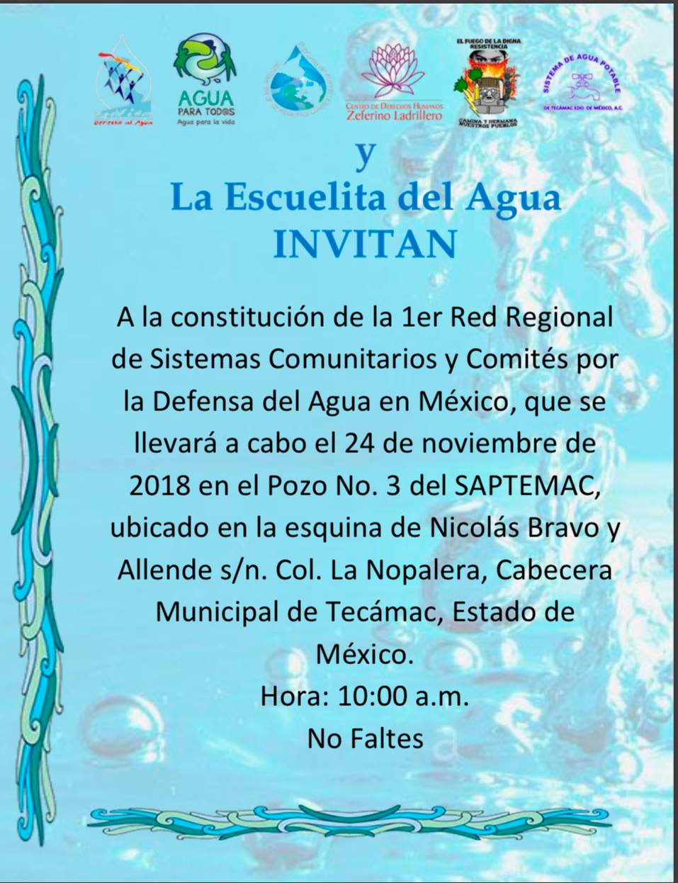 Después de dos años de aprendizaje, intercambio de ideas, puntos de vista y un fuerte estrechamiento de lazos de amistad, la Escuelita del Agua ha creado las bases para que, ahora en este noviembre del 2018, los Sistemas Comunitarios de Agua Potable y los Comités por la defensa del agua que participaron activamente en los cursos de la Escuelita durante el 2017 y 2018, ahora pasemos a una nueva fase organizativa en donde nos constituyamos como Red y así tener la fuerza requerida para defender el Derecho Humano al Agua y Saneamiento. Es de muchos mexicanos conocido que ese Derecho está decretado en el artículo 4º de nuestra Carta Magna desde el 8 de febrero del 2012, sin embargo ha habido indolencia y falta de voluntad política del Congreso Mexicano para reglamentar dicho Derecho, tal como lo mandata el artículo 3º transitorio del decreto: